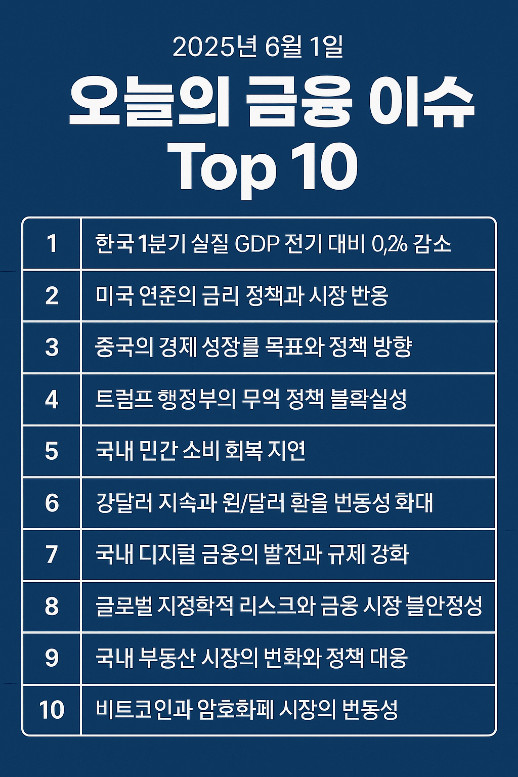 2025년 6월 1일 기준으로 국내외 금융시장은 여러 중대한 변곡점에 직면하고 있습니다. 각국의 경제 지표 발표, 통화정책 변화, 지정학적 리스크의 확대 등으로 인해 투자자와 기업은 한층 더 불확실한 환경에 놓이게 되었습니다. 오늘은 특히 검색량이 많고 투자자들이 민감하게 반응한 주요 10가지 금융 이슈를 중심으로 상세히 분석해보겠습니다.